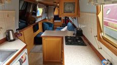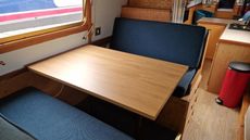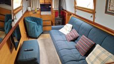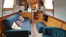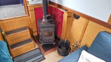 Standard layout with main open plan living area towards the bow of the boat, with a Morso solid fuel stove.