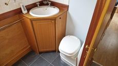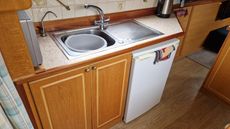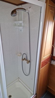 Moving towards the stern of the boat is the shower room with a cassette toilet, corner vanity unit with sink and enclosed shower unit.
