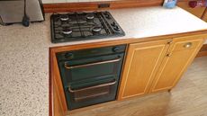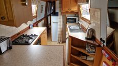 Next is the galley with 4 ring gas hob, grill and oven, fridge, stainless steel sink and microwave, etc.