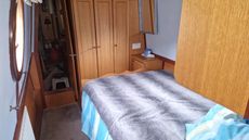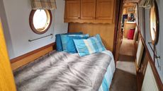 The Bedroom is at the stern with a fixed double bed, built in wardrobes, overhead locker, and storage cabinet.