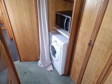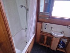 Opposite the galley and through a door is the bathroom which comprises of a Hip type bath with shower over the top, cassette toilet, hand wash basin, airing and storage cupboards
