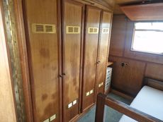 Moving down the steps and to the port side is a separate large bedroom with fixed double bed, 2 x built in double wardrobes, dressing table and several draw units.